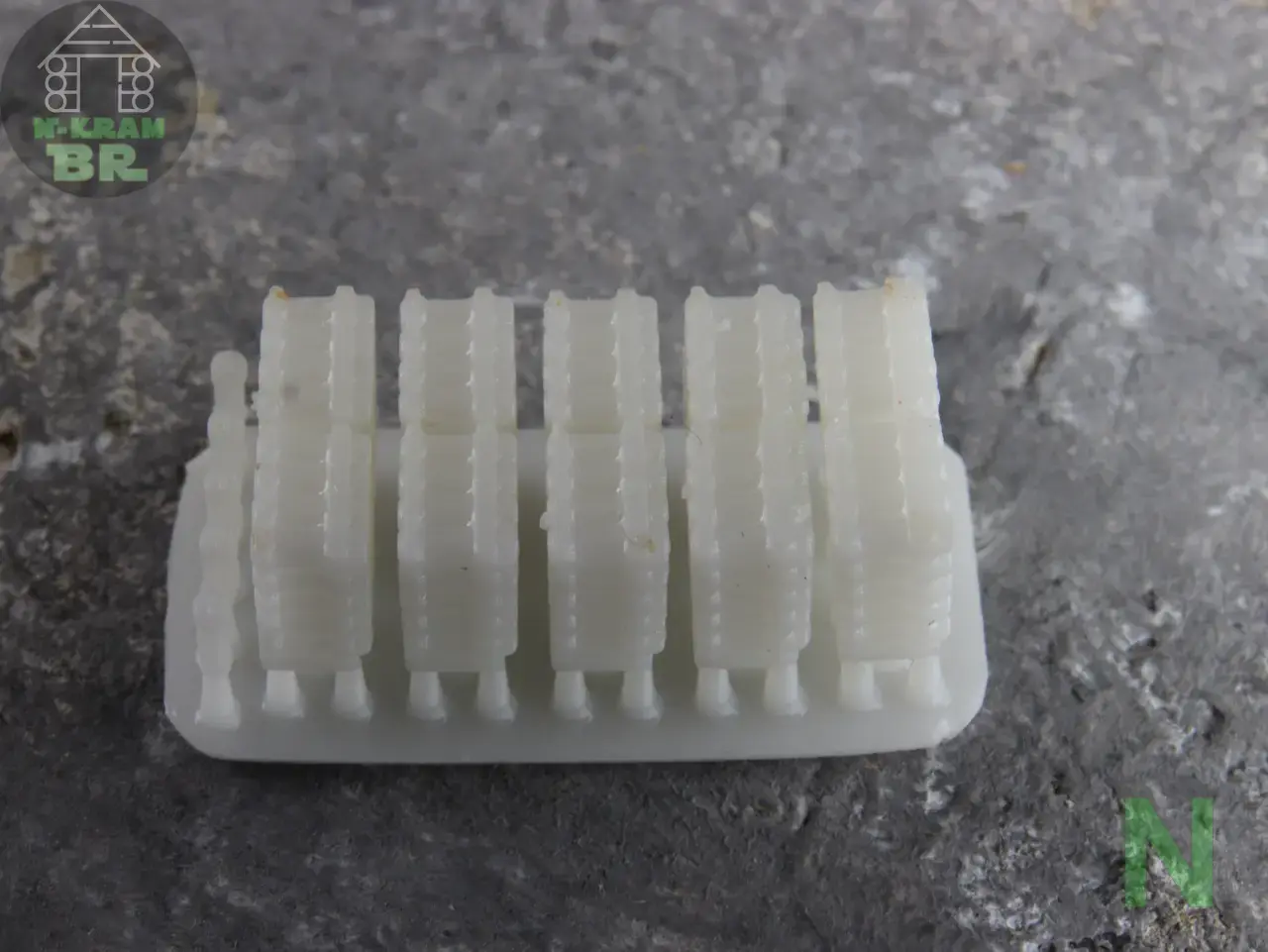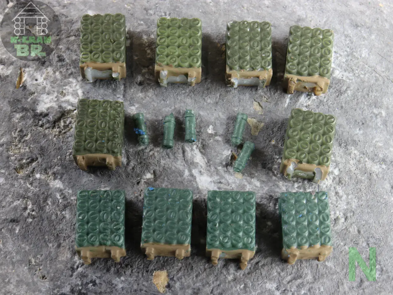 Dieser Artikel besteht aus einem Träger, der 10 Paletten mit je 24 TuLBeh für 155mm Haubitzen in N sowie 5 lose TuLBeh enthält. Die Paletten und Behälter müssen von der Grundplatte getrennt und versäubert werden. Die 155mm Behälter und die Paletten können dann mit den herkömmlichen Modellbaufarben prima bemalt werden.
