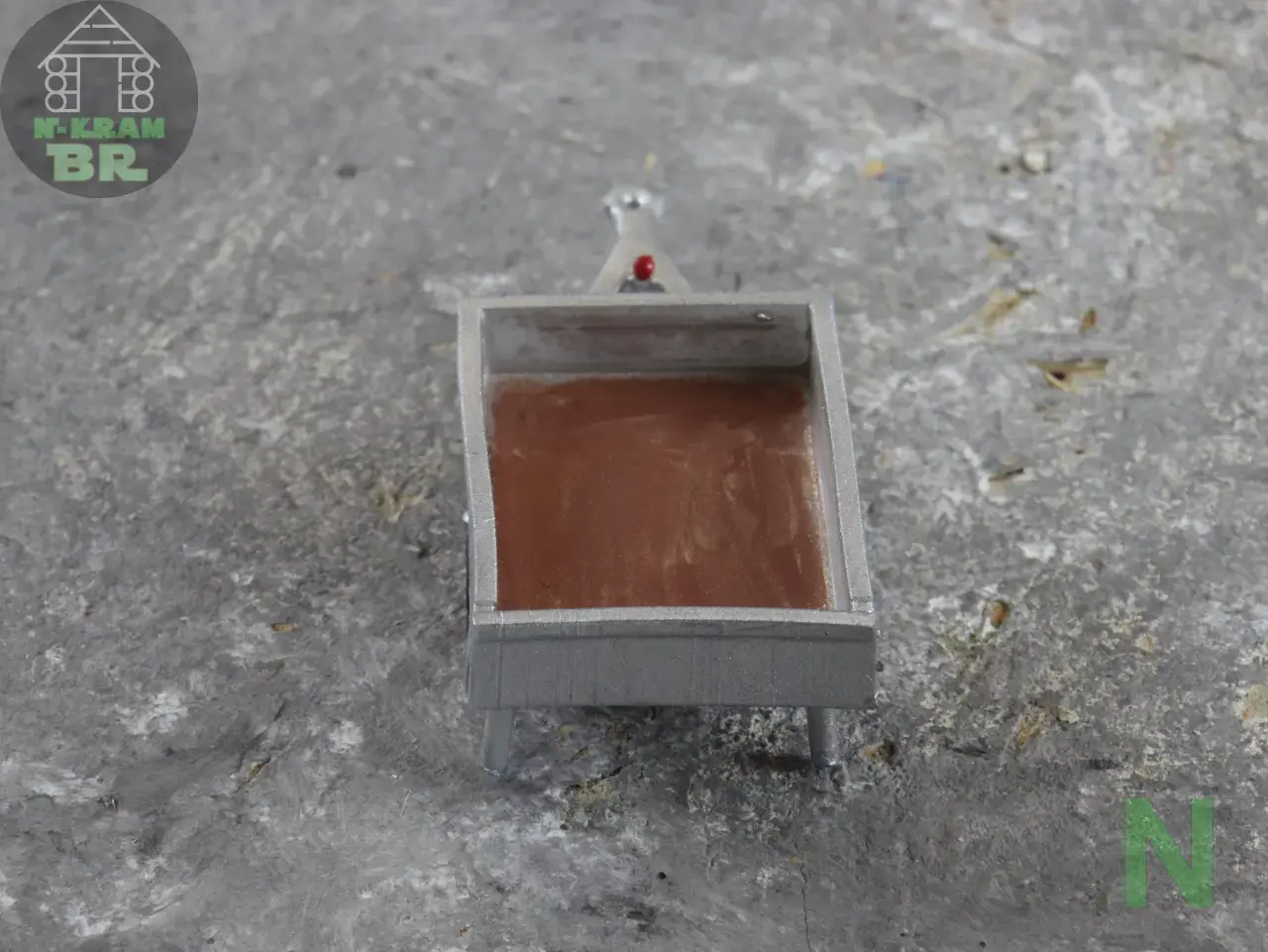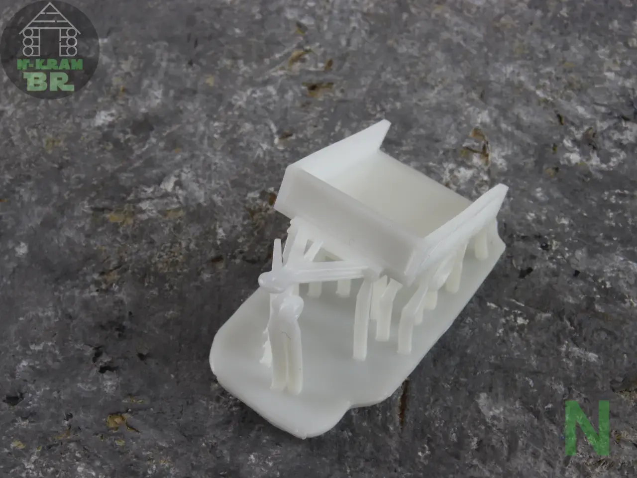 Für das 3D-Druckteil ist noch einige Nacharbeit notwendig. Auf der Unterseite sind noch die Ansätze der Supports, die erhaben aus dem Boden ragen. Die sollte man noch vorsichtig einebnen. Die Standfüsse bitte nicht mit Supports verwechseln. Dann kann die Heckklappe eingesetzt werden. Diese kann geöffnet oder geschlossen dargestellt werden. Danach kann der Anhänger bemalt werden. In Fahrtstellung sollte das Bugrad abgeschnitten werden und ggf wagerecht neu positioniert werden.