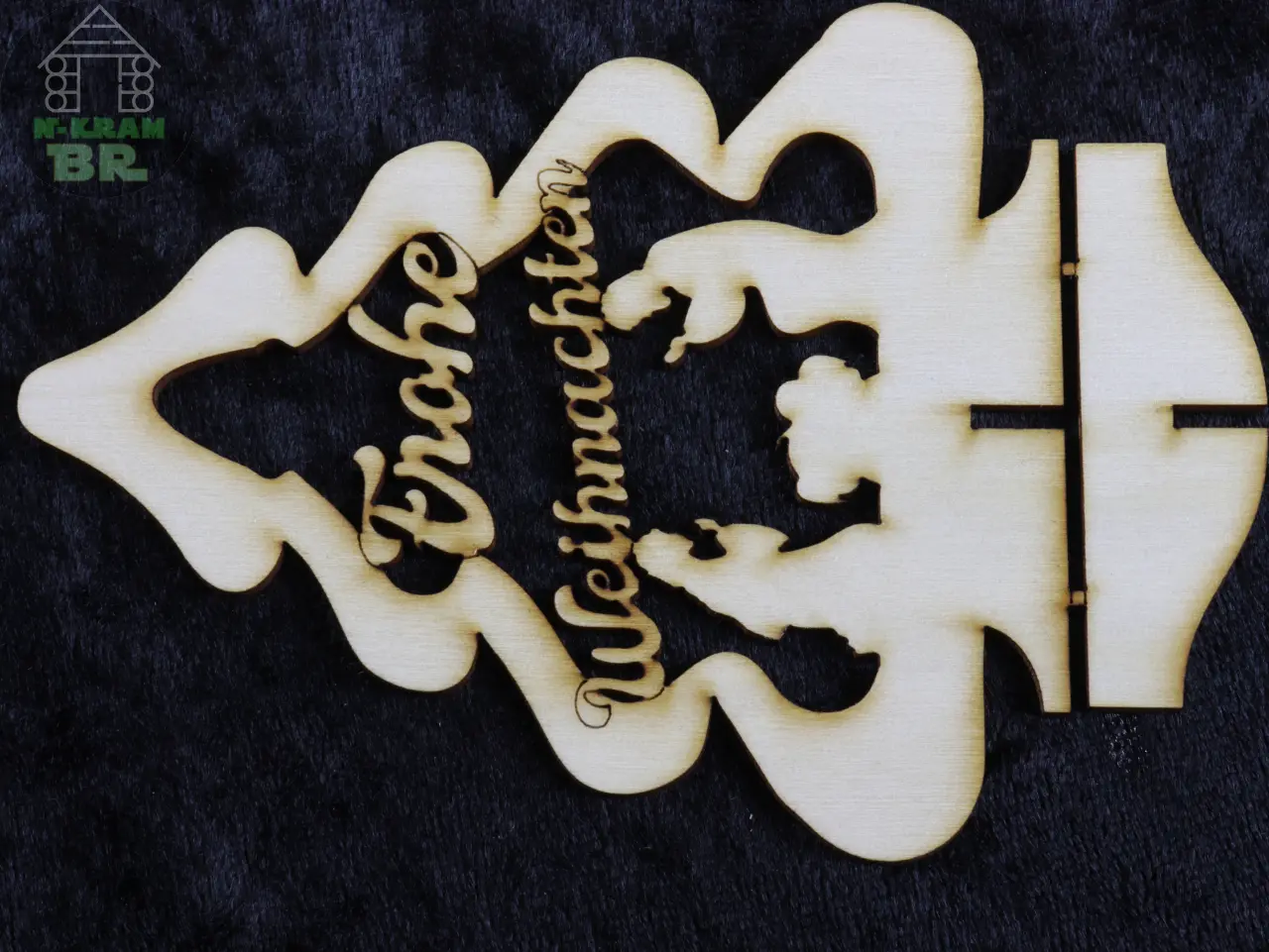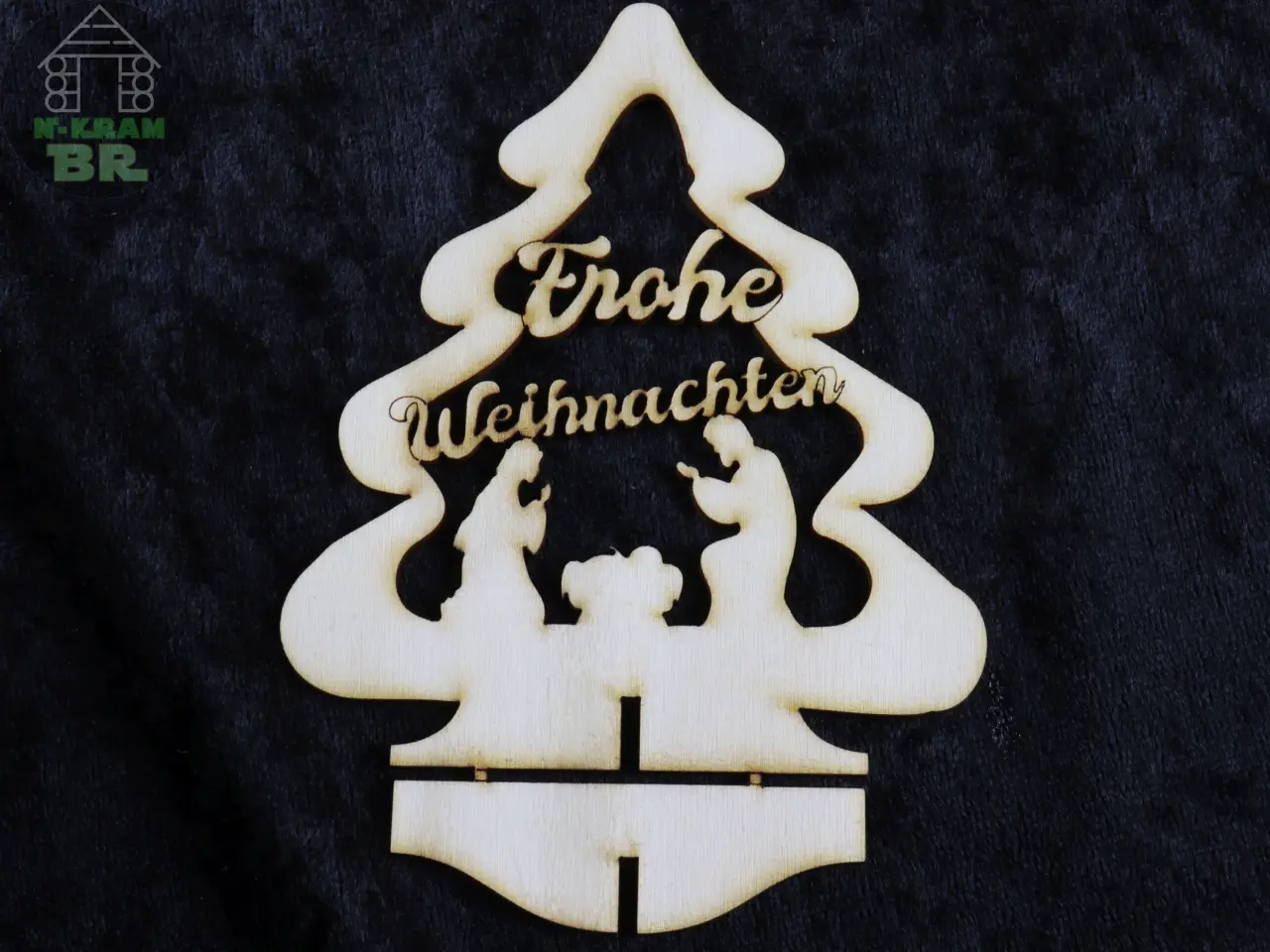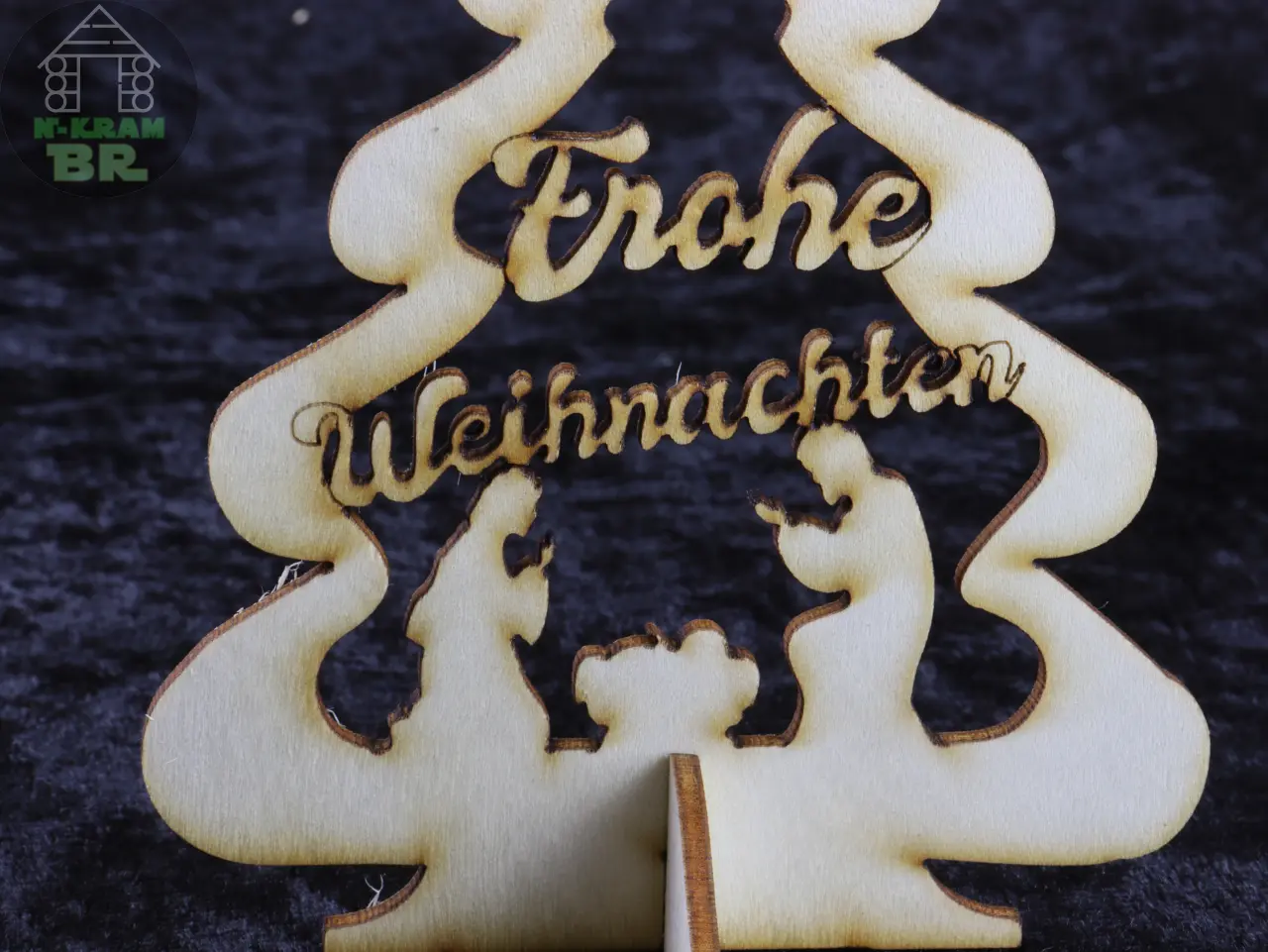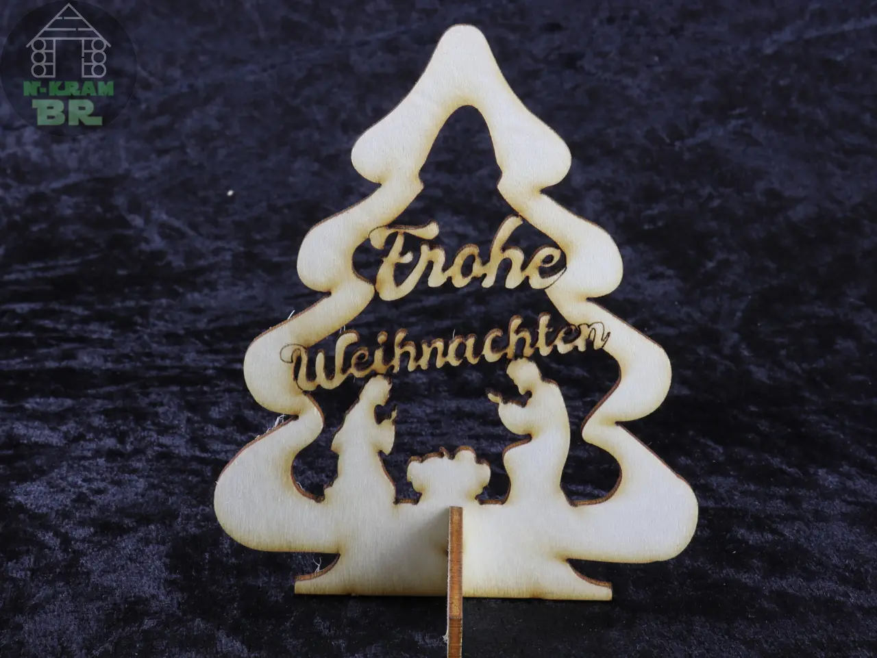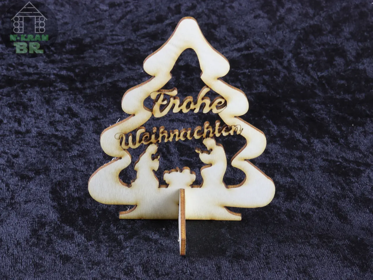 Der Baum hohl mit Text eignet sich prima zur Kleindekoration. Am Arbeitsplatz etwa oder wenn Zuhause nicht so viel Platz ist. Man kann das Bäumchen auch prima verschenken. Der Baum besteht aus einer einzelnen Schicht 2mm Sperrholz und ist etwa 9cm hoch und 7,5cm breit. Das Bäumchen ist geschwungen dargestellt und hat in der Aussparung eine Krippenszene und einen Weihnachtsgruß. Zum Aufstellen muss nur der Fuß aus der dünnen Halterung gebrochen werden und unten an den Baum aufgesteckt werden. Dann fällt der Baum hohl mit Text auch nicht so leicht um. Der Fuß kann jederzeit wieder entfernt werden, damit das Bäumchen bei der Aufbewahrung etwas flacher ist.
