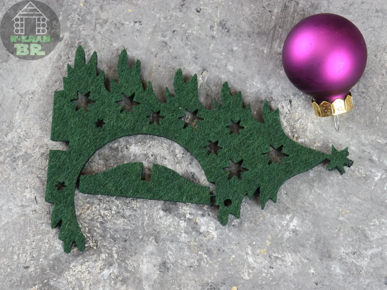 Der Baum mit Kugel Filz eignet sich prima zur Kleindekoration. Am Arbeitsplatz etwa oder wenn Zuhause nicht so viel Platz ist. Man kann das Bäumchen auch prima verschenken. Der Baum besteht aus einer einzelnen Schicht 3mm dunkelgrünem Filz und ist etwa 9cm hoch und 6cm breit. Auf der Spitze ist ein Stern, wer den nicht möchte, kann den Stern auch einfach abschneiden. Die Fläche des Bäumchens ist mit ein paar ausgelaserten Sternen verziert. Mit dem Bäumchen wird eine farbige Kugel nach Wahl mitgeliefert, welche ans Bäumchen angehängt werden kann. Die Kugel, welche in verschiedenen Farben zur Verfügung steht, hat einen Durchmesser von 2,5cm. Zum Aufstellen muss nur der Fuß , der am Bäumchen hängt, abgeschnitten und unten an den Baum aufgesteckt werden. Dann fällt der Baum mit Kugel auch nicht so leicht um. Solange die Kugel aber beim Hinstellen noch nachschwingt, sollte man das Bäumchen festhalten, es ist sehr leicht und könnte umfallen. Der Fuß kann jederzeit wieder entfernt werden, damit das Bäumchen bei der Aufbewahrung etwas flacher ist.