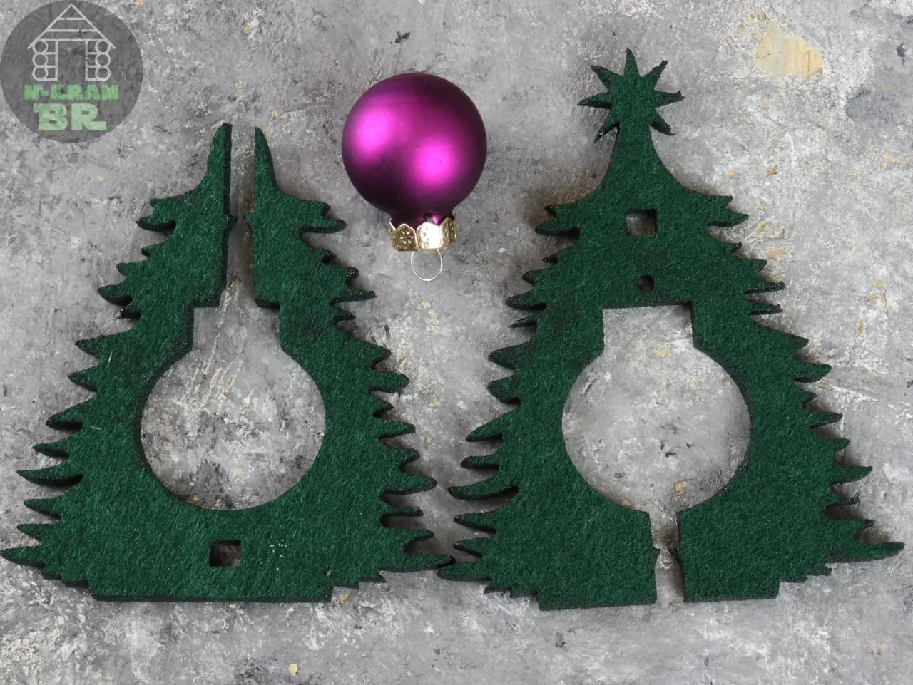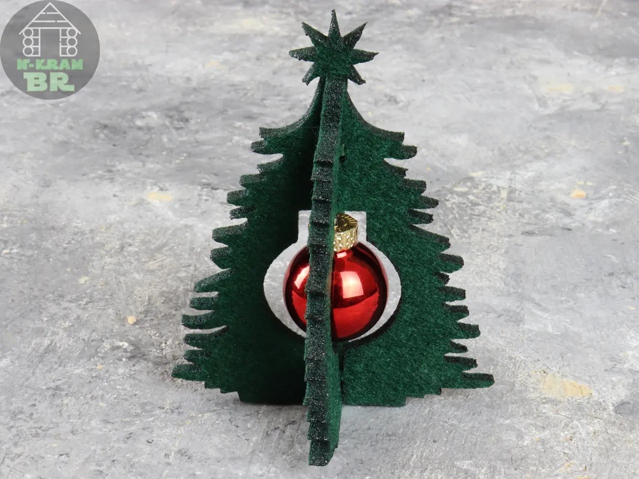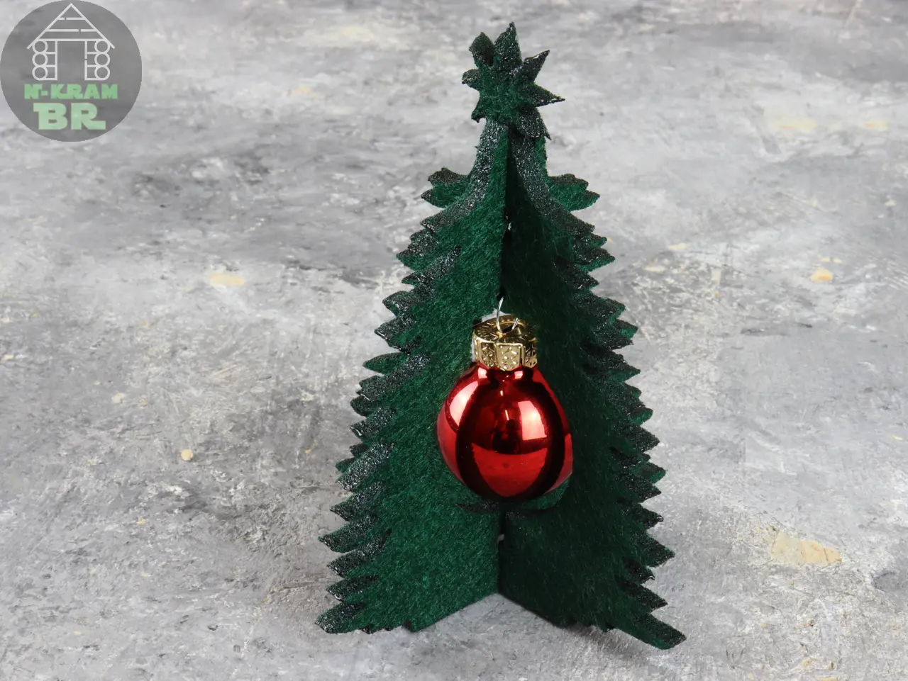 Der Baum 2fach mit Kugel Filz eignet sich prima zur Kleindekoration. Am Arbeitsplatz etwa oder wenn Zuhause nicht so viel Platz ist. Man kann das Bäumchen auch prima verschenken. Der Baum besteht aus zwei Teilen aus 5mm dunkelgrünem Filz, die einfach zusammengesteckt werden. In der Mitte ist Platz für eine 25mm Kugel, deren Farbe gewählt werden kann.