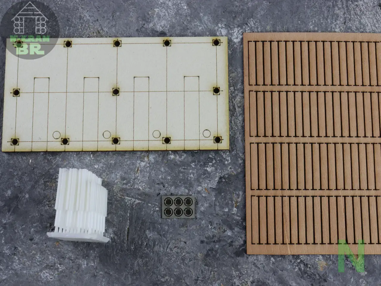 Der Bausatz besteht aus Finnpappe, Echtholzfurnier und einem Träger mit 3D-Druckteilen. Der zusammenbau ist einfach, kann aber sehr gut variiert werden. Dazu bittte die Bauanleitung vor dem Kauf lesen.