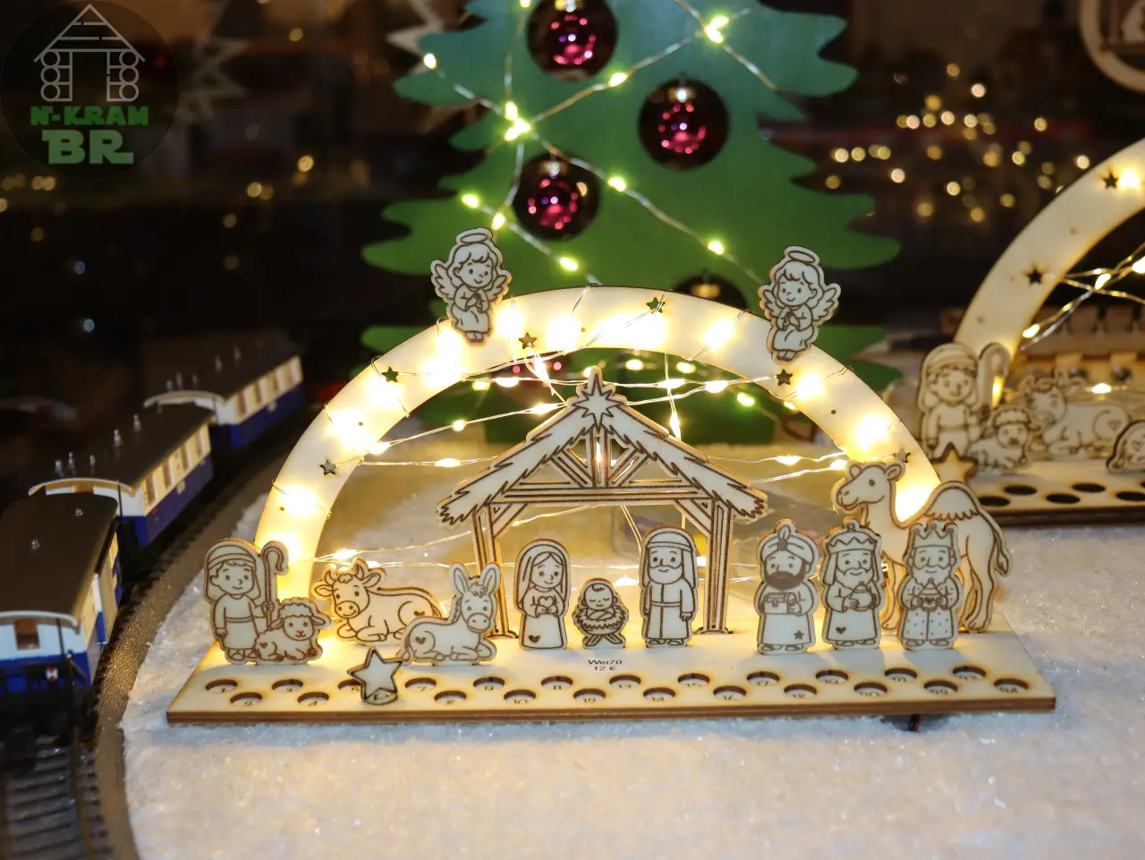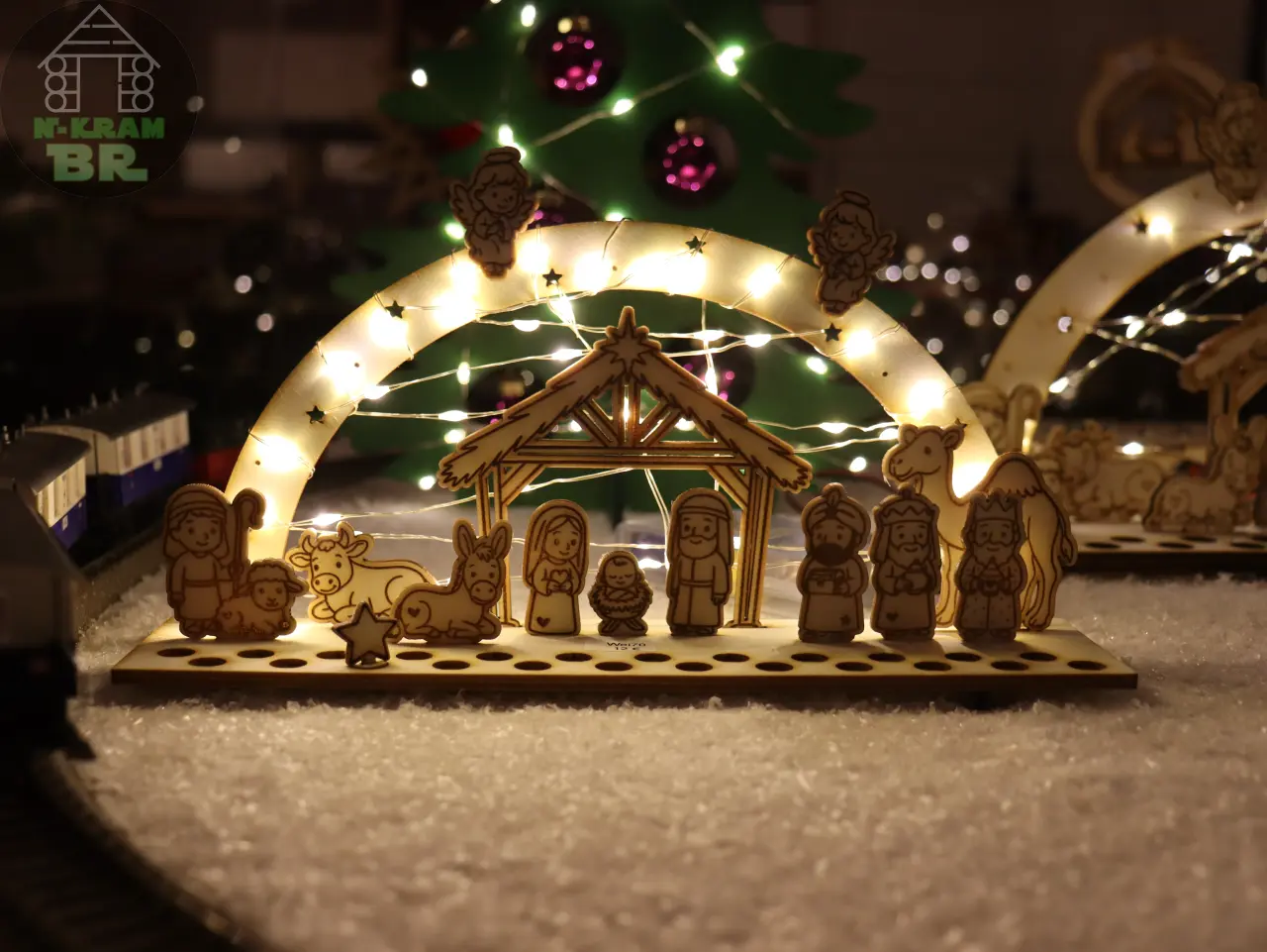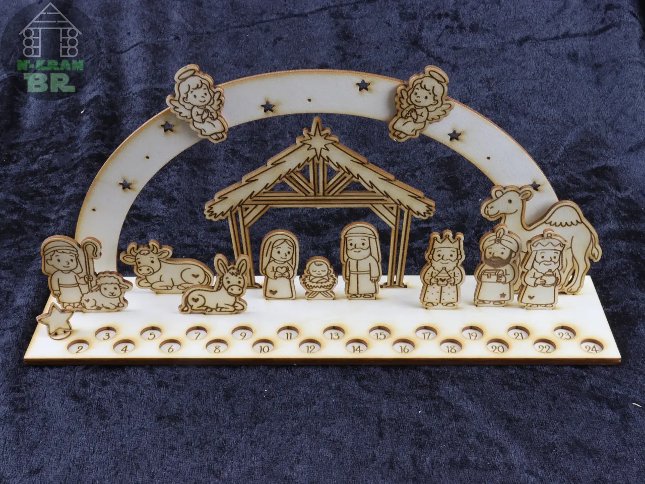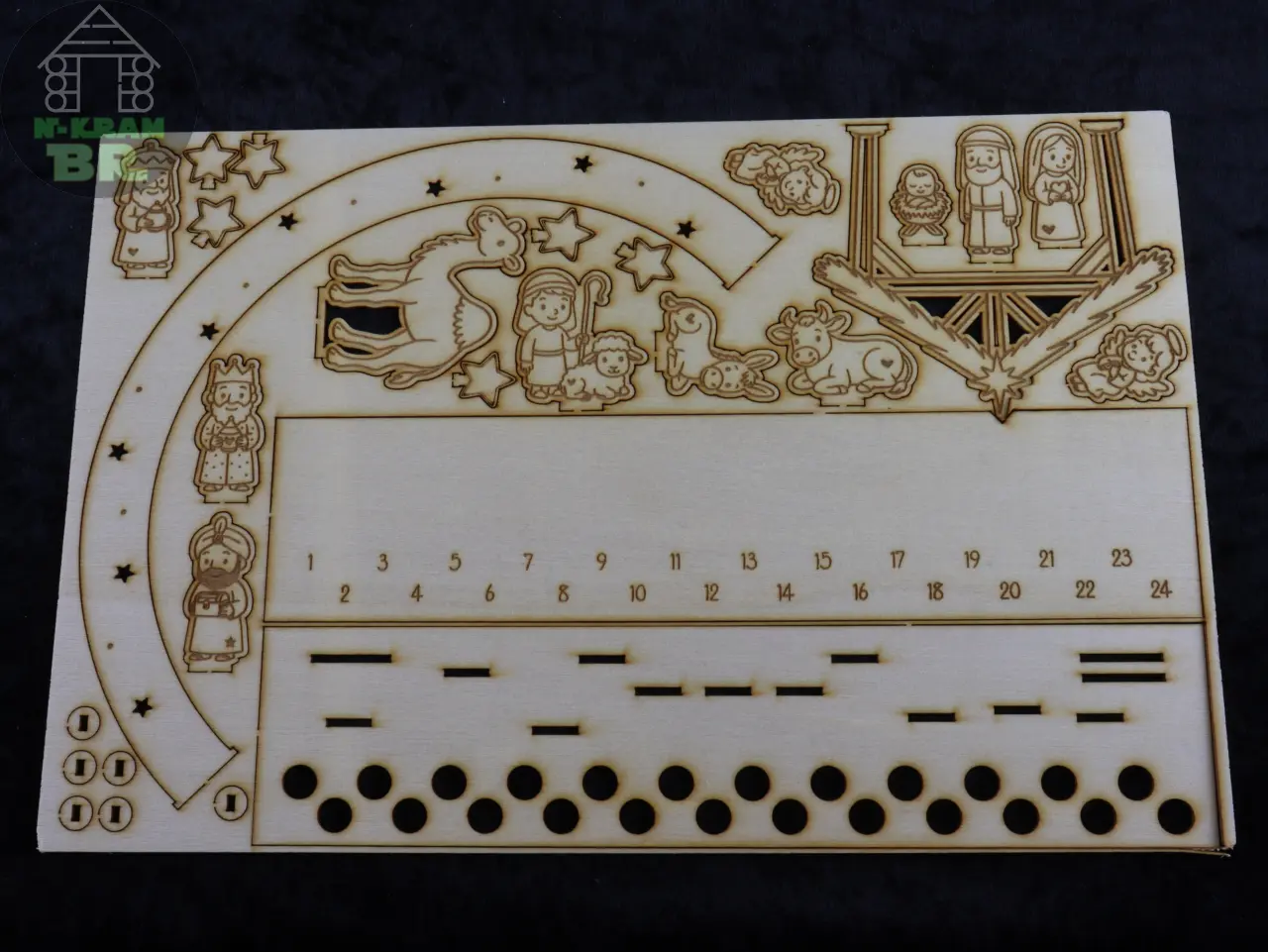 Dieser kleine Bausatz vereint einen Adventskalender mit einem Krippenbogen. Ideal für wenig Platz im Zimmer oder Büro. Dieser Bausatz ist auf einem Din-A4 Sperrholzbrettchen in 2mm Stärke gelasert und kommt auf eine Höche von 11cm. Der Krippenbogen zeigt eine typische Krippenszene mit Maria, Josef und dem Jesuskinchen. Ochse und Esel und einbSchäfer sowie die drei heiligen Könige mit Kamel sind ebenfalls da. Im Vordergrund ist eine Leiste mit Löchern an deren Grund die Zahlen 1-24 stehen. Ein kleiner Stern auf einer runden Scheibe kann dort platziert werden und jeden Tag ein Feld weitergerückt werden – so man ihn nicht festklebt.