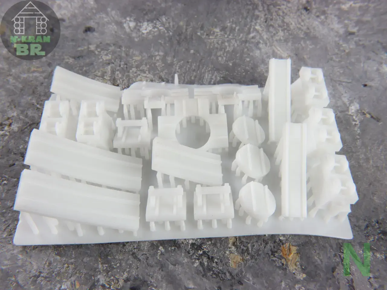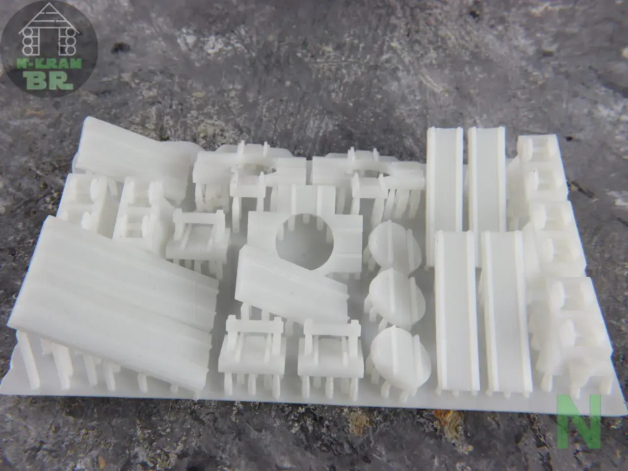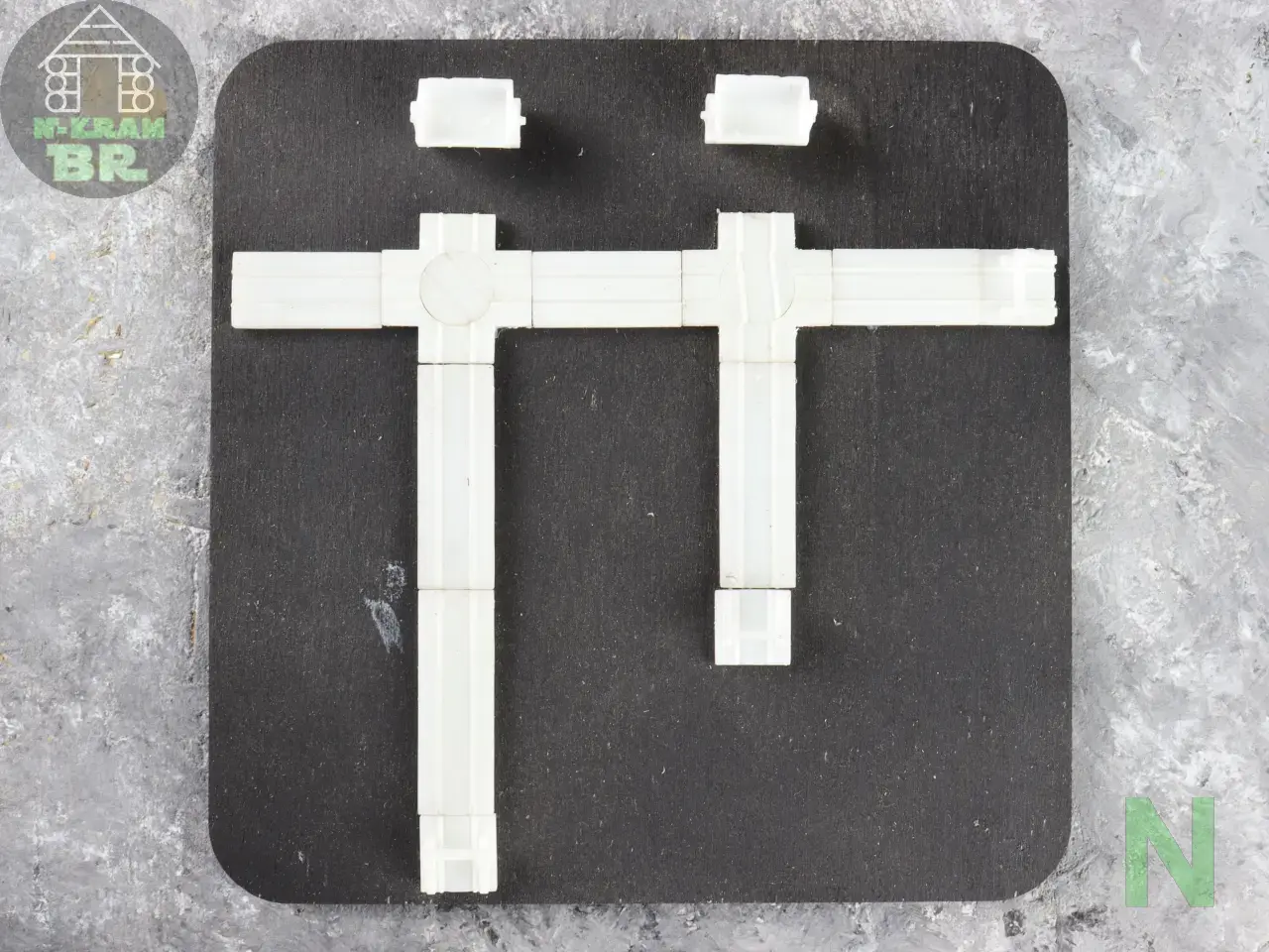 Die Bahn kann durch die Einzelteile beliebig zusammengesetzt werden. Die Teile haben keine Verbinder, sie werden einfach auf dem Untergrund passend aneinandergeklebt. Die Drehscheiben sind extra dabei und können in beliebiger Position eingeklebt werden. Der Inhalt der Packungen ist auf den Bilder sichtbar. Es empfiehlt sich eine Bemalung mit handelsüblichen Modellbaufarben.