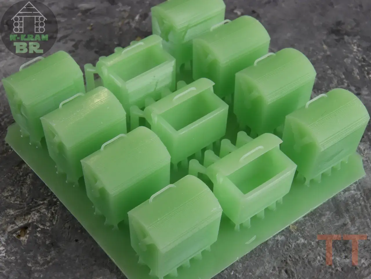 Hat man größere Mengen Abfall, benutzt man dafür nicht mehrere Mülltonnen, sondern mehr Müll fassende Müllcontainer. Diese sind aus Metall oder Kunststoff gefertigt und können silbern, dunkelgrau oder blau sein. Alle typischen Behälterfarben halt. Zur leichteren Bewegbarkeit stehen sie auf Kunststoffrollen, die in alle Richtungen drehbar sind. Der Bausatz enthält 11 unbemalte Container, drei davon sind offen dargestellt und können für verschiedene Szenen genutzt werden. Die Container haben angedeutete Rollen auf der Unterseite. Man könnte mit einer LED ein Feuer andeuten oder jemand entsorgt Müll darin. Auf jeden Fall weitere Farbtupfen zur Detaillierung der Modellbahnanlage.