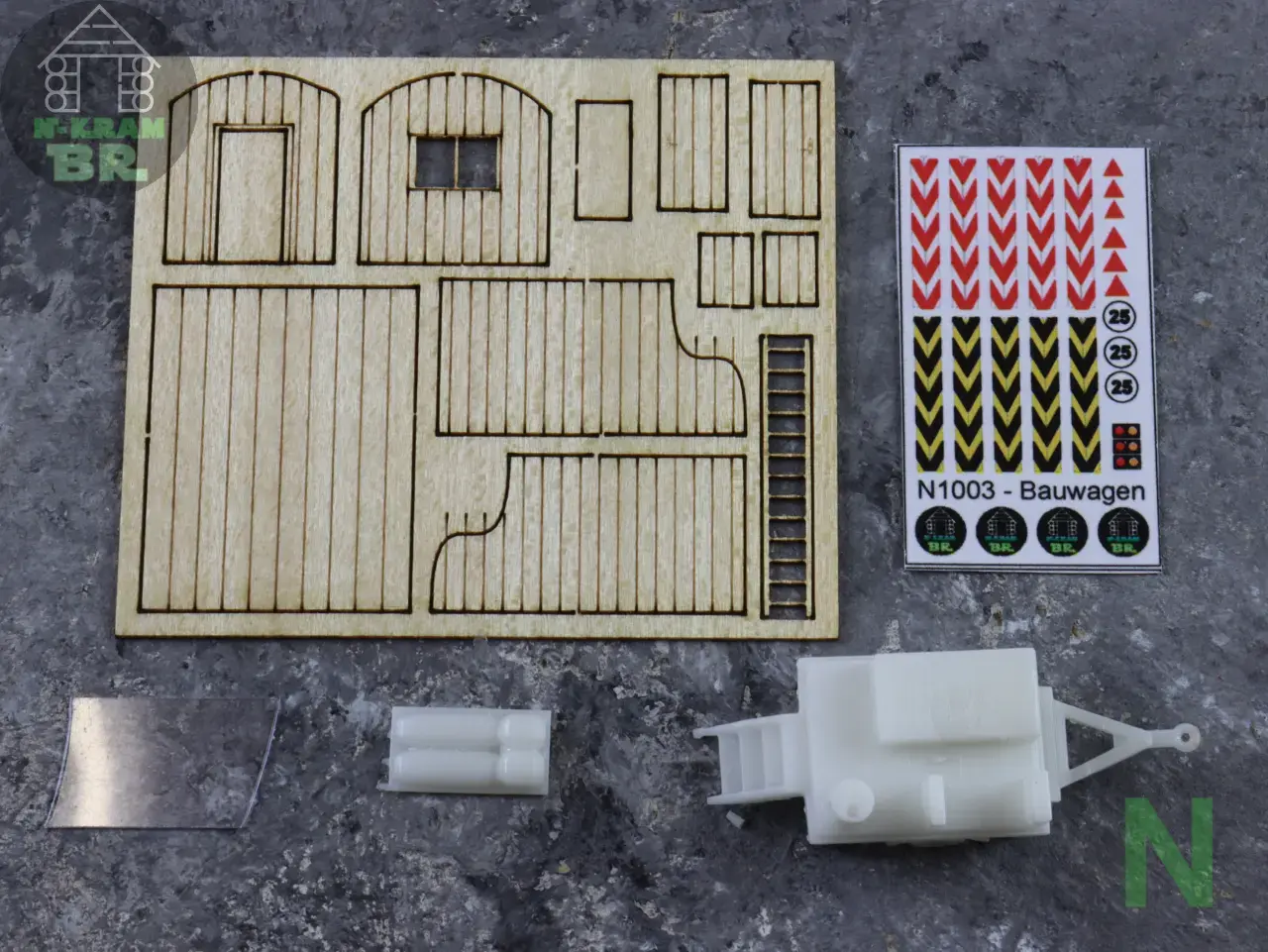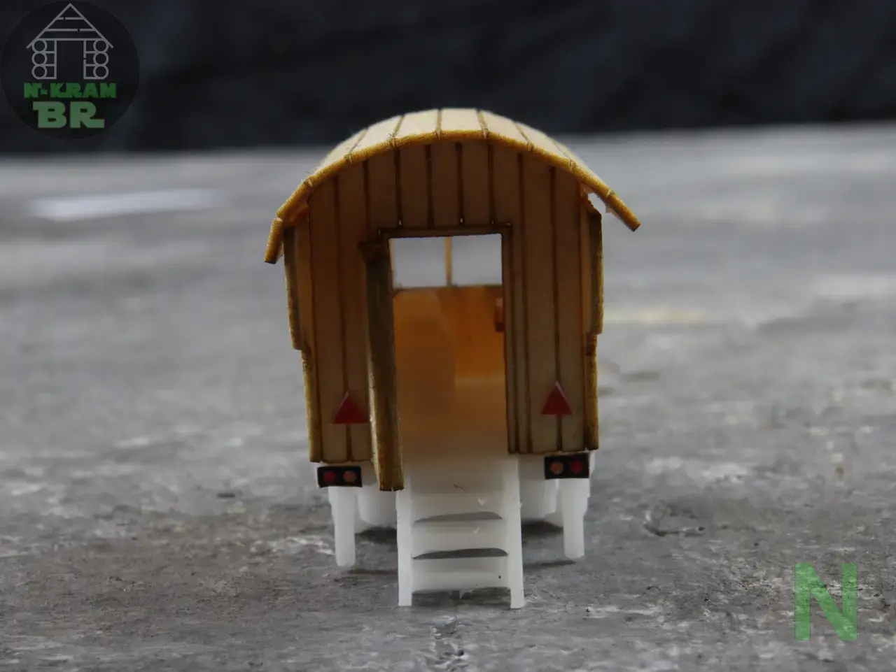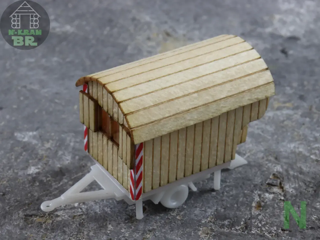 Auf der Modellbahnausstellung in Mellrichstadt wurde ich von einem Modellbahner angesprochen, dass der Bauwagen etwas zu groß sei und er einen Schäferwagen suche. Und hier ist er auch schon. Diesen kurzen Schäferwagen habe ich durch Umbau des Bauwagens recht schnell zur Serienreife bringen können. Er ist deutlich kürzer, als der Bauwagen, hat aber dennoch eine Inneneinrichtung. Ein Bett sowie ein Tisch und ein Ofen sind dafür bereits im Chassis eingebaut. Das Bett kann entweder mit den gedruckten Betteil dekoriert werden oder es könnte auch eine kleine Szene im Wagen eingebaut werden, darum ist sie nicht fest eingebaut.