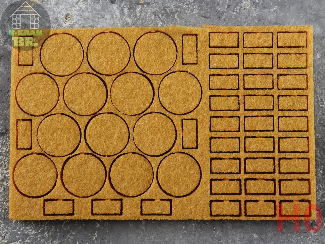 Strohballen sind der Klassiker bei der Landschaftsdekoration. Aber als 3D-Druck vermochten sie mich nicht so recht zu überzeugen. Eigentlich überhaupt nicht. Auch die Plastikprodukte aus der Fabrik gefallen mir nicht so recht. Also muss man sich was neues überlegen. Was faseriges und farblich passendes. Und laserbar soll es auch sein. Gleich drei Anforderungen auf einmal. Die Lösung ist unglaublich einfach. Farblich passender Filz. Und aus dem habe ich nun einen Bausatz für 41 Strohballen H0 hergestellt.