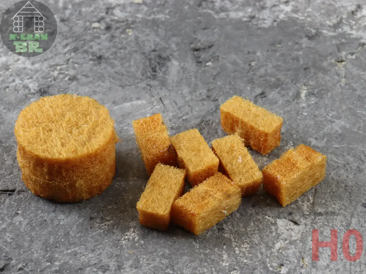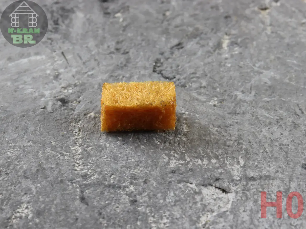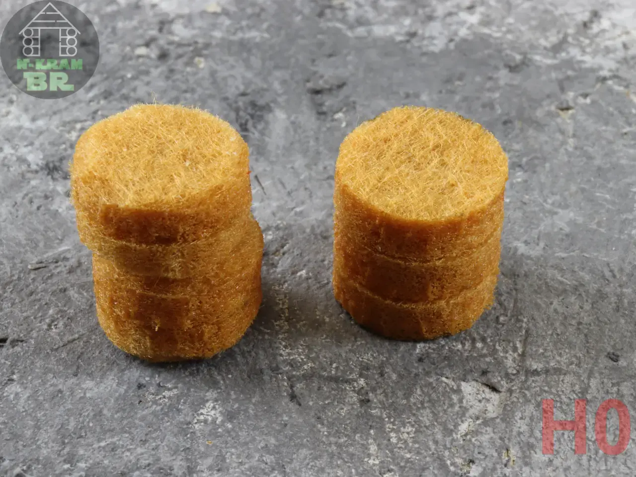 Es sind 34 quaderförmige und 7 runde Strohballen H0. Dafür müssen nur zwei der runden Teile zusamengeklebt werden und schon ist unser Ballen fertig. Die runden Ballen sind etwa 9mm dick und haben einen Durchmesser von etwa 13mm. Bei zwei Schichten. Man kann natürlich auch drei Schichten aufeinanderkleben. Man kann sogar Strohballenfiguren damit bauen. Das gibt prima Blickfänge und Farbtupfer auf der Anlage. Die quaderförmigen Ballen sind etwa 8,4×4,3×3,6mm groß. Die Ballen werden am Besten mit einem Skalpell aus dem Träger getrennt und können farblich nachbehandelt werden. Solten einzelne Fasern nicht durchtrennt sein, bitte mit dem Skalpell oder einer scharfen Schere heraustrennen, nicht reißen, denn das würde die Struktur durcheinanderbringen und nicht schön aussehen.