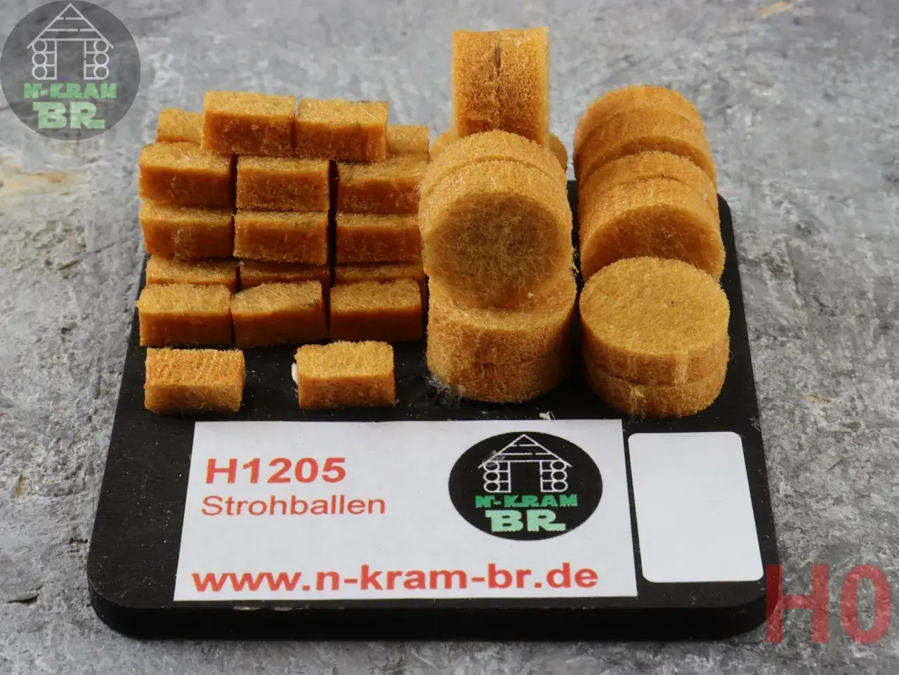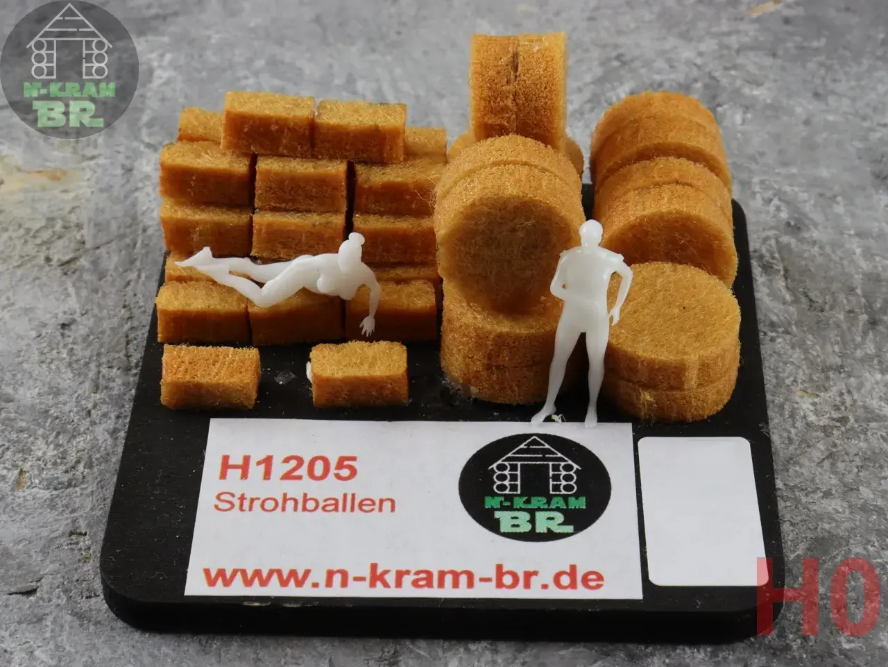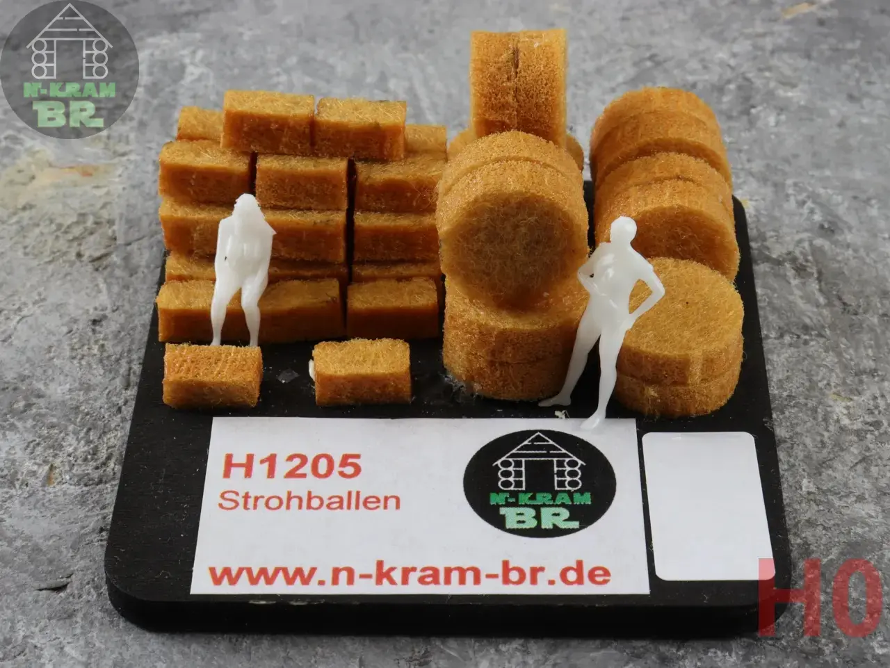 Es sind 34 quaderförmige und 7 runde Strohballen H0. Dafür müssen nur zwei der runden Teile zusamengeklebt werden und schon ist unser Ballen fertig. Die runden Ballen sind etwa 9mm dick und haben einen Durchmesser von etwa 13mm. Bei zwei Schichten. Man kann natürlich auch drei Schichten aufeinanderkleben. Man kann sogar Strohballenfiguren damit bauen. Das gibt prima Blickfänge und Farbtupfer auf der Anlage. Die quaderförmigen Ballen sind etwa 8,4×4,3×3,6mm groß. Die Ballen werden am Besten mit einem Skalpell aus dem Träger getrennt und können farblich nachbehandelt werden. Solten einzelne Fasern nicht durchtrennt sein, bitte mit dem Skalpell oder einer scharfen Schere heraustrennen, nicht reißen, denn das würde die Struktur durcheinanderbringen und nicht schön aussehen.