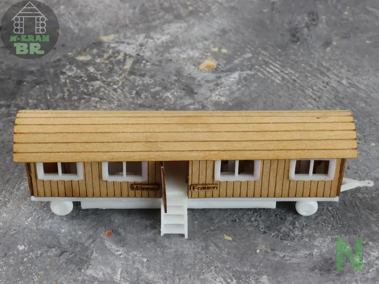 Da die Serie der Wagen für Schausteller entstanden ist, braucht es natürlich auch einen Toilettenwagen. Aber wie das so ist bei mir, eine leere Hülle ist das nicht. Es sind erstens schon mal getrennte Bereiche für Männer und Frauen, eine hölzerne Türe schhließt diese Bereiche ab. Auf der Männerseite sind zwei Toilettenschüsseln in jeweils einer Kabine, eine Pinkelrinne und drei Waschbecken. Auf der Frauenseite sind es fünf Kloschüsseln und vier Waschbecken. Das Besondere ist, dass man die Türen offen darstellen kann und dann die Einrichtung tatsächlich auch sieht. Es sind sogar Klobrillen jund Klodeckel aus Echtholz dabei. Und Wegweiser und auch ein paar Schildchen. Ein Loch im Boden ist für die Beleuchtung gedacht, damit man auch die Einrichtung erkennen kann. Zusammen mit den anderen Wagen kann man schon ein größeres Volksfest oder einen Zirkus damit ausstatten.